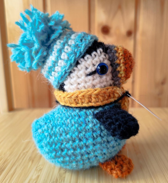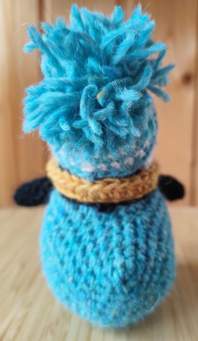 Breezy the puffin wearing glacier blue sweater, scarve and hat (made from Icelandic wool yarn)