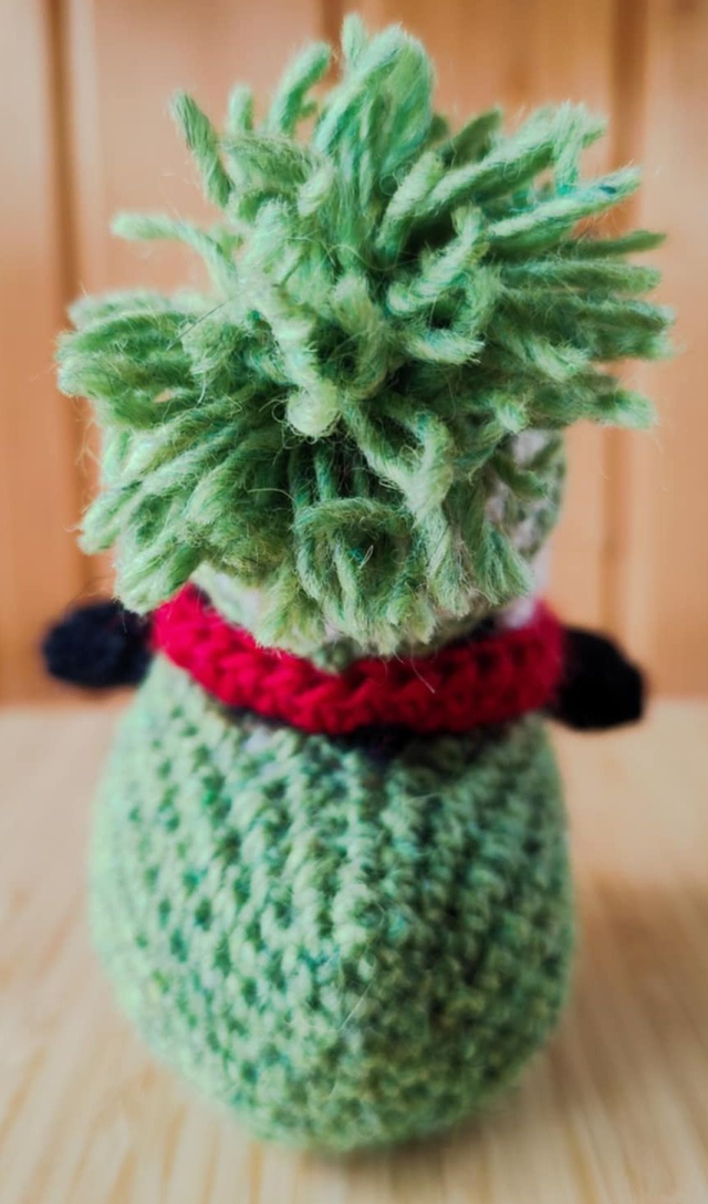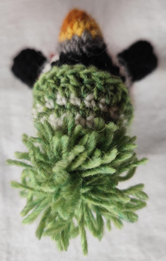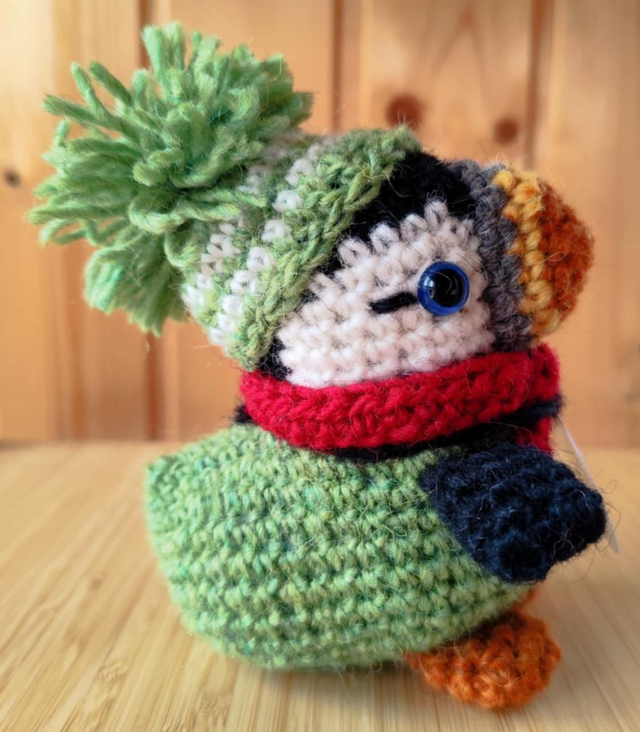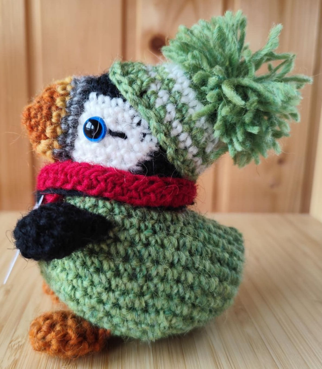 Kiwi the puffin wearing spring green sweater, scarve and hat (made from Icelandic wool yarn)