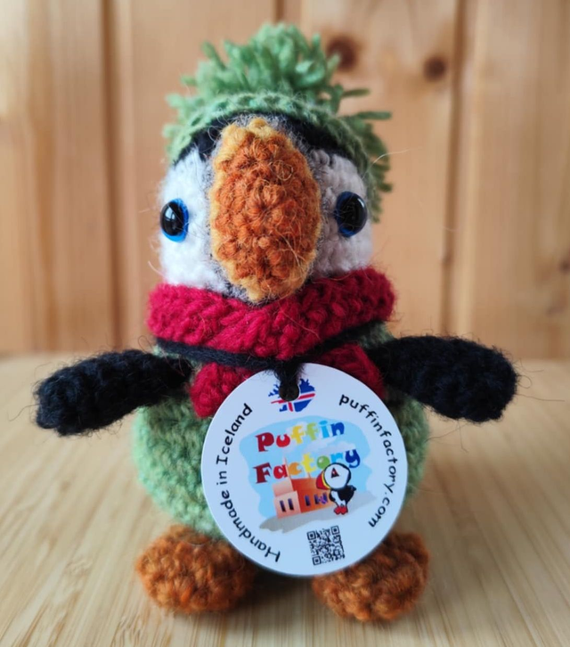 Introducing our handmade crochet puffin, made in Iceland with love and care. This adorable puffin stands at 15cm in height with a width of 11cm and depth of 11m, making it the perfect size for any shelf or desk! Handcrafted with high-quality materials, this puffin boasts intricate details and vibrant colours that are sure to brighten up any space. Our crochet puffin makes for a unique gift idea or a fun addition to any collection. Not only is it cute and cuddly, but it also represents the beauty of Iceland's wildlife, making it a must-have keepsake.