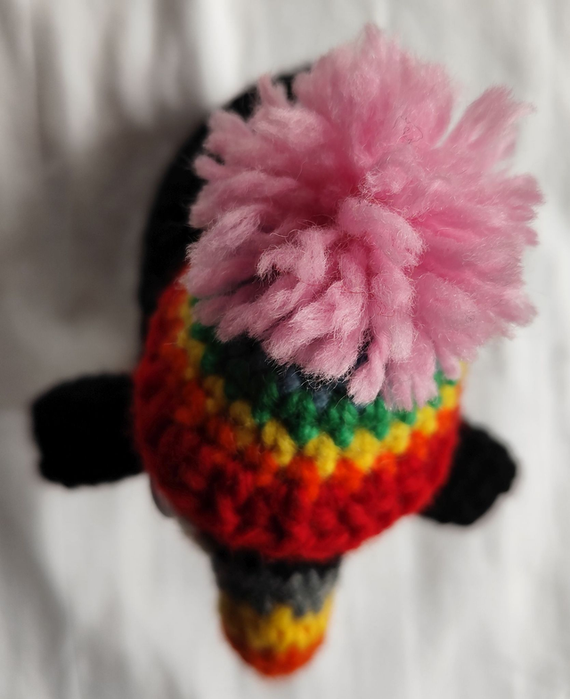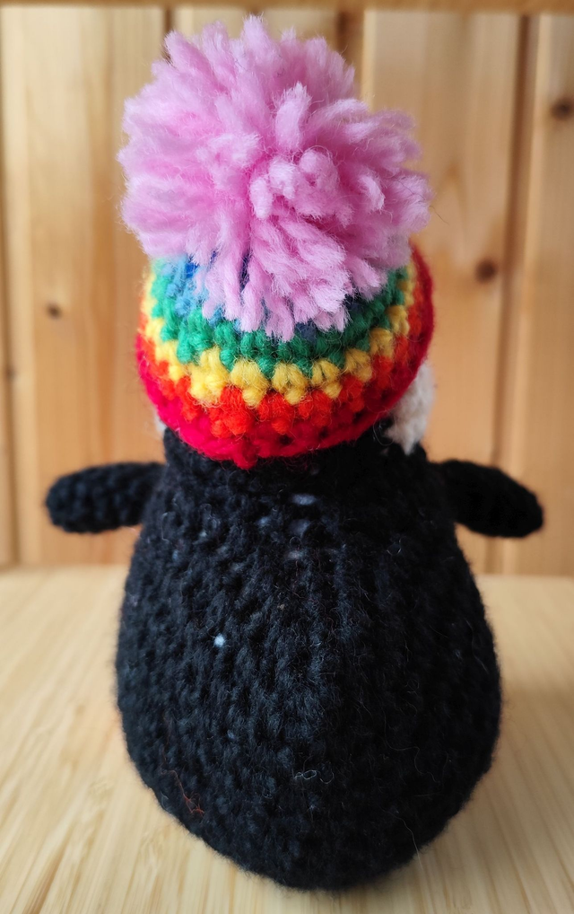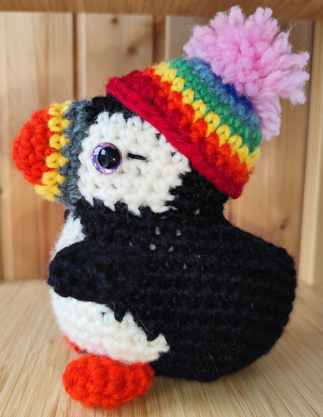 Muffin the puffin with rainbow hat, large size (made from Norwegian wool yarn)