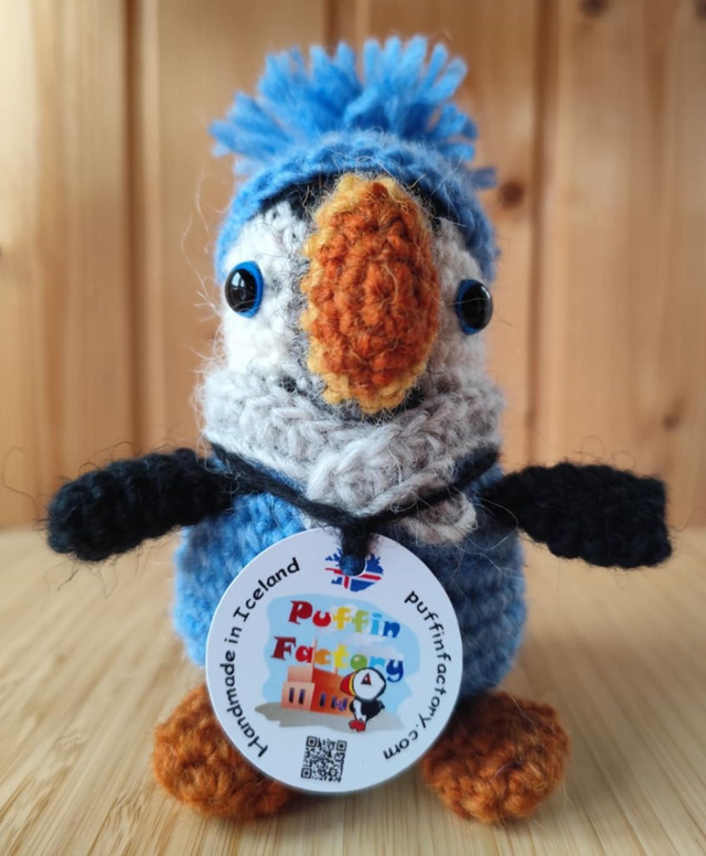 Introducing our handmade crochet puffin, made in Iceland with love and care. This adorable puffin stands at 15cm in height with a width of 11cm and depth of 11m, making it the perfect size for any shelf or desk! Handcrafted with high-quality materials, this puffin boasts intricate details and vibrant colours that are sure to brighten up any space. Our crochet puffin makes for a unique gift idea or a fun addition to any collection. Not only is it cute and cuddly, but it also represents the beauty of Iceland's wildlife, making it a must-have keepsake.